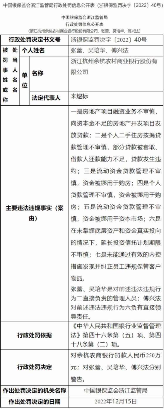 中国银保监会浙江监管局依据《中华人民共和国银行业监督管理法》第四十六条第(五)项、第四十八条第(二)项,对余杭农商银行罚款人民币250万元;对张蕾、吴培华、傅兴法分别警告。